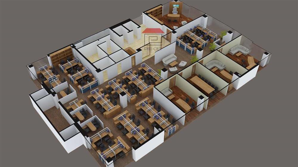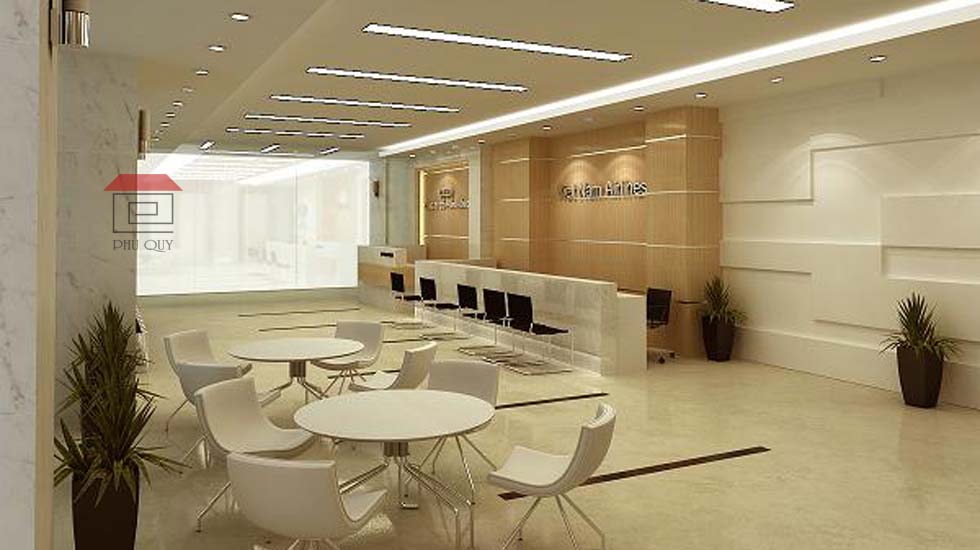 Nội thất văn phòng được thiết kế theo hướng mở. Không gian làm việc chung của nhân viên được bố trí các bàn làm việc đối diện nhau. Giữa các bàn làm việc được ngăn cách bởi vách ngăn bàn làm việc.