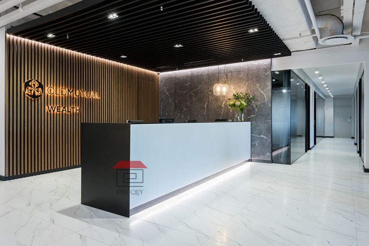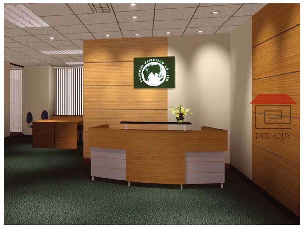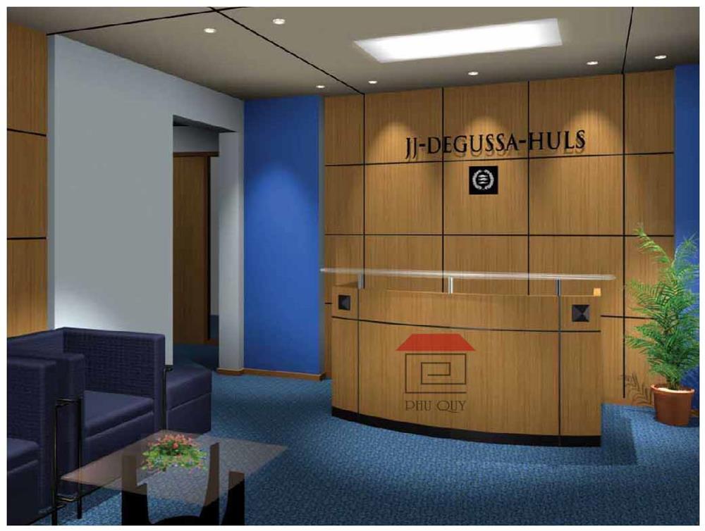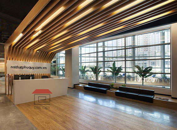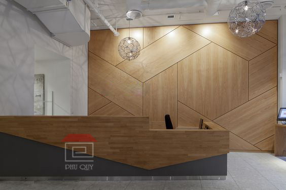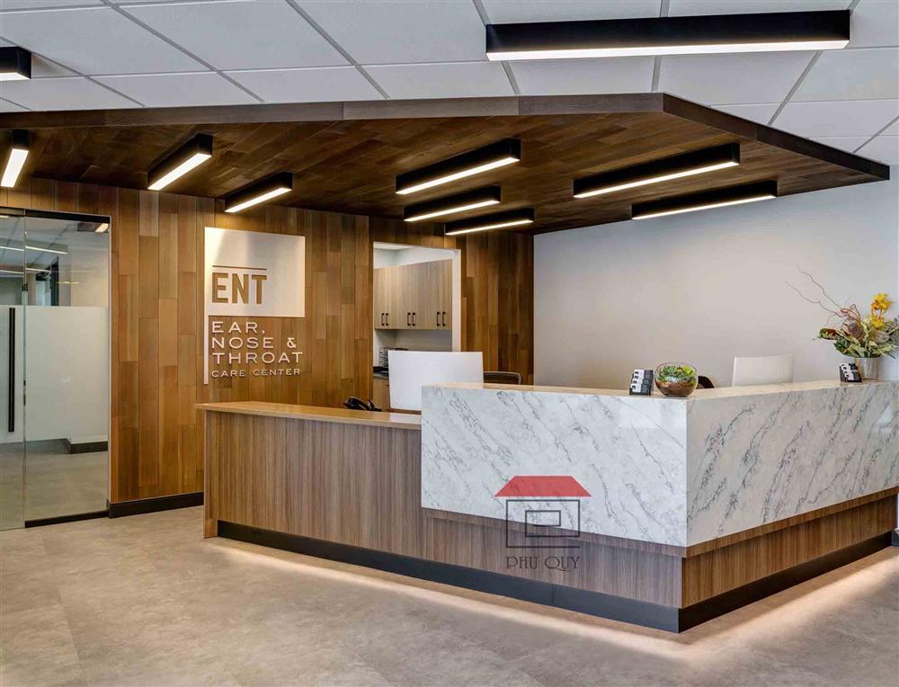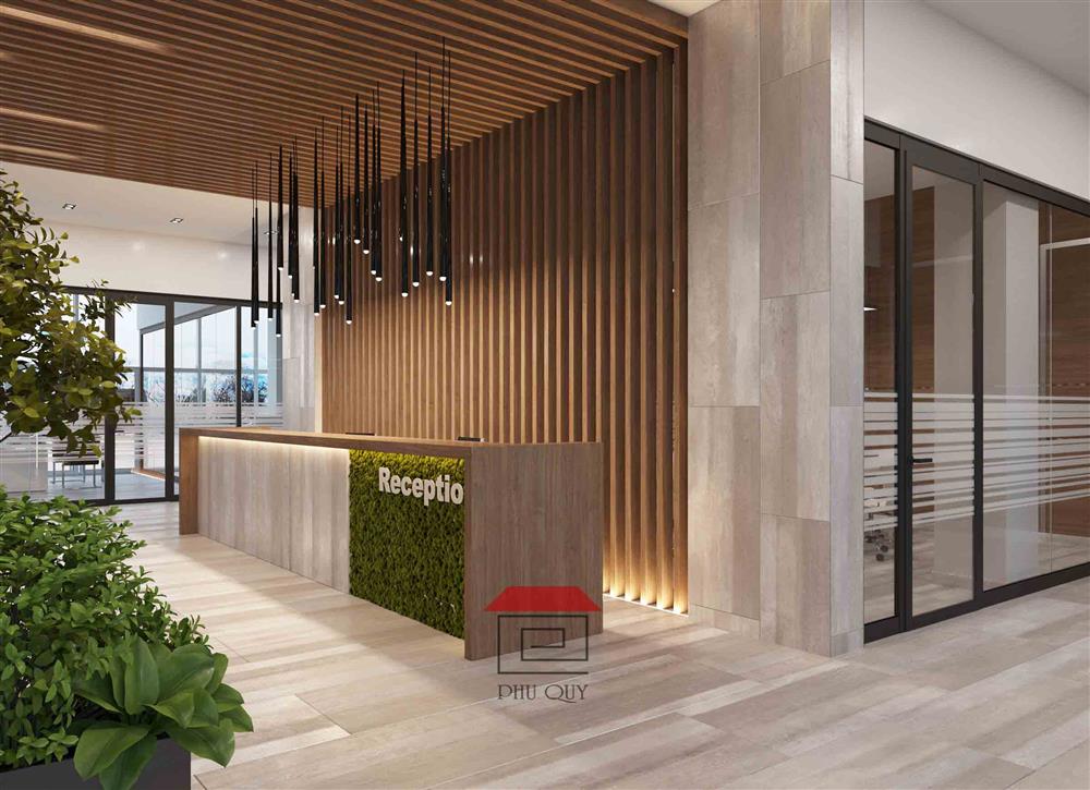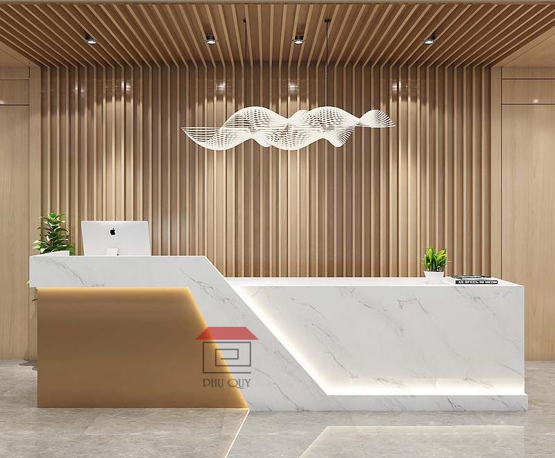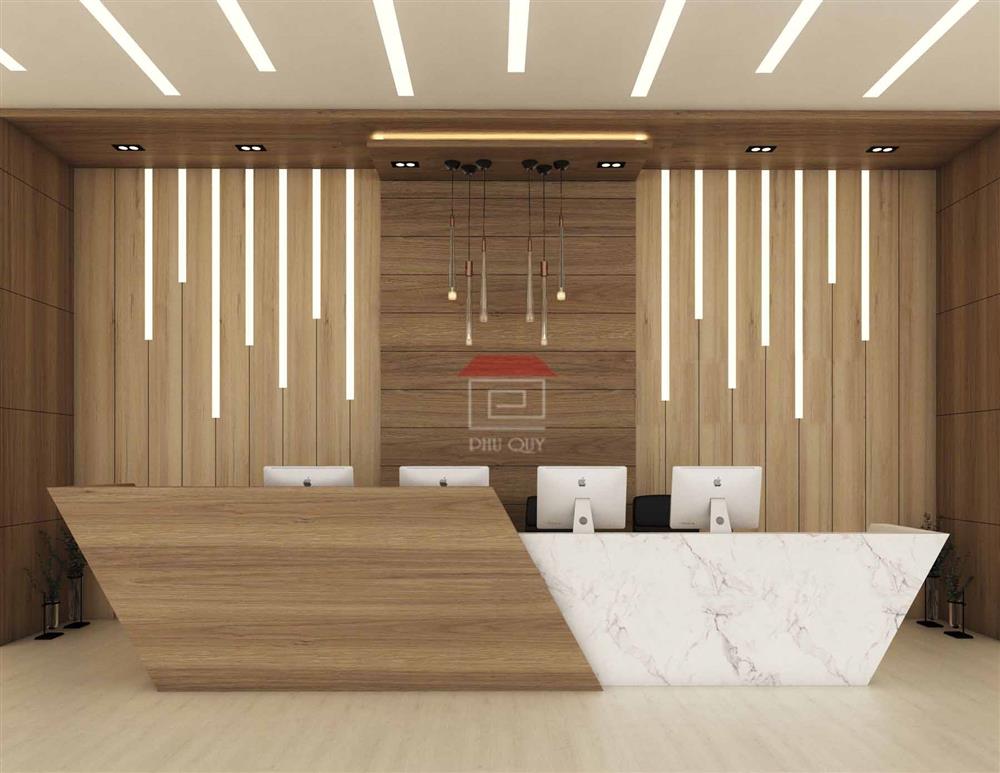 Đây là điểm nhấn chính, cần được thiết kế đẹp mắt, sang trọng và phù hợp với phong cách chung của văn phòng. Quầy lễ tân không nên quá to hay nhỏ mà cân nhắc theo diện tích căn phòng.